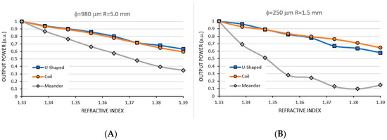 Figure 12 shows the simulations for RI sensing for both sensors. In Figure 12A we presented the simulation for the 980 µm-5.0 mm. It is observed that the result for the coil-shaped is similar to the U-shaped sensor, with an output power drop of approximately 40% in the whole RI range. However, the meander-shaped sensor is much more sensitive, with a 90% power drop for the same range. In Figure 12B we show the simulation result for the 250 µm-1.5 mm sensors. Notice that, for the coil-shaped and U-shaped sensors the results are similar to the 980 µm fiber, but for the meander-shaped sensor the simulation shows a much better sensitivity.