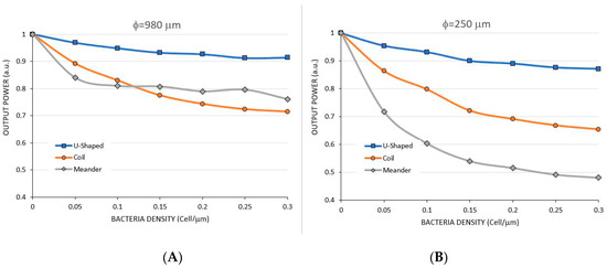 These two sensor diameters were also simulated for bacteria density, as shown in Figure 13. Again, the meander-shaped showed best sensitivity in the range of zero to 0.05 Cell/μm for both fiber diameters. However, notice that, differently from the results in RI sensing, the coil-shaped sensor showed a better sensitivity than the U-shaped sensor.
