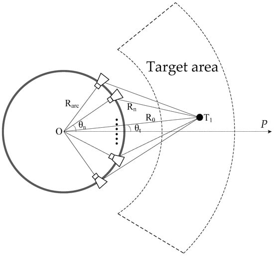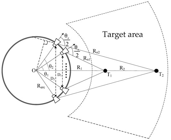 where is the maximum value of , and is the minimum value of . The azimuth angle-sampling interval in Equation (11) depends on the system frequency, the target distance, and the beamwidth of the antenna element. However, the arrangement of the arc antenna array requires a specific sampling interval, so we will combine antenna beamwidth with arc observation geometry for further analysis.