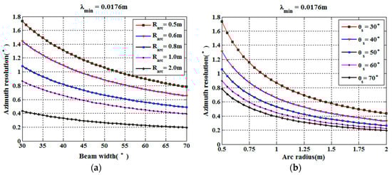 Azimuth angle resolution of GB-AA-SAR: (a) Azimuth angle resolution for different arc radii; (b) Azimuth angle resolution for different antenna beamwidths.