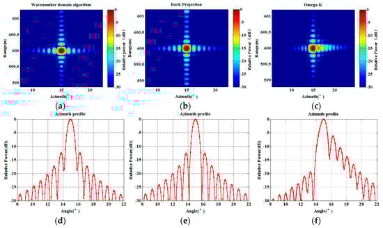 The point target imaging simulation using the proposed wavenumber imaging algorithm is carried out. The imaging results are compared with the results of the BP algorithm and the efficient omega-k algorithm in order to verify the imaging performance of the proposed algorithm. Figure 6 shows the imaging results of the three algorithms. Figure 6a is the point target imaging result using the proposed wavenumber domain imaging algorithm, Figure 6b is the point target imaging result of the BP algorithm, and Figure 6c gives the result of the efficient omega-k algorithm. Correspondingly, Figure 6d–f show the azimuth profile of the three imaging algorithms. It can be seen that all of the algorithms can finish the point target focus. In order to quantitatively compare the imaging performance of the algorithms, we measure the image quality parameters: impulse response width (IRW), peak sidelobe ratio (PSLR), and integrated sidelobe ratio (ISLR). IRW is the main lobe width of impulse response value above −3 dB, which is also known as resolution [17].