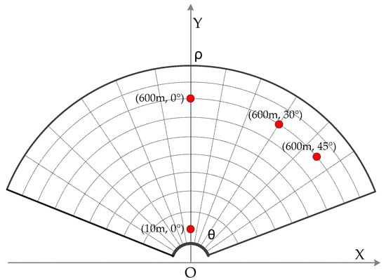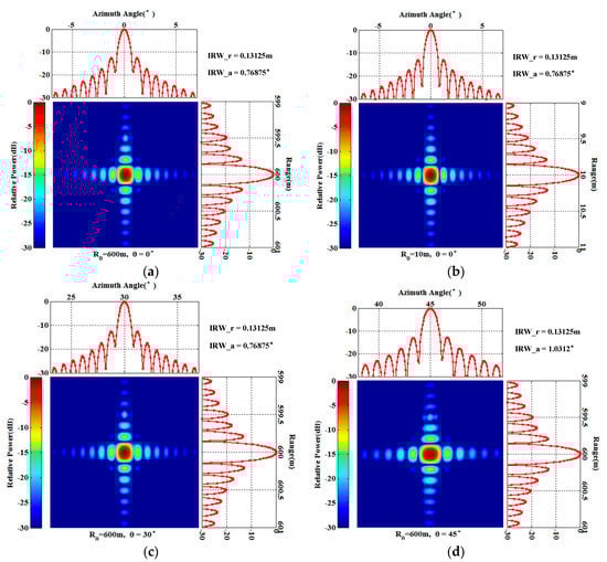In order to verify the 2D resolution sufficiently, point targets at (600 m, 0°), (10 m, 0°), (600 m, 30°), and (600 m, 45°) are analyzed respectively. The distribution of the targets is shown in Figure 7. As shown in Figure 8a,b, it can be seen that the resolutions are the same for the targets with different distances. Figure 8a,c shows the focus results of the targets with the same observation distance, but different azimuth angles. The resolutions are consistent with the conclusion and the theoretical values previously analyzed. However, in Figure 8d, when the azimuth angle of the target expanded to 45°, the azimuth resolution decreased. The reason is that the angle range of the arc array is designed as [−60°, 60°], when the target is at 45° in azimuth, there are not enough array antennas to illuminate the target [15,18]. Correspondingly, the azimuth resolution decreases with the reducing of the azimuth synthesis aperture, which is not contradictory to the conclusion that the azimuth resolution has spatially invariant properties. This phenomenon also occurs in the linear array case; thus, it is not a new phenomenon. In practice, if it is necessary to carry out regional observation with a super-wide view angle, and the cost is allowed, the optimal solution is to increase the arc length and the number of antenna elements. The sub-optimal solution is to realize data acquisition by the mechanical rotating of the arc array, which is low-cost but inefficient. Both solutions can realize high-resolution and super-wide view angle imaging processing.