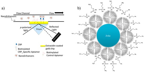 Vance et al. proposed an SPR-based nano-aptasensor with a LOD of 5 fg/mL in spiked human serum [72]. A cystamine/glutaraldehyde/extravidin surface chemistry was used to bind biotin-labeled aptamers (59-GGGCCTCCGGT -TCATGCCGC-39), specific for CRP, onto a gold surface of a prism. The signal output was amplified (about 18%) by coating the aptamers with near-infrared quantum nanodots (NIR-QDs, nanoenhancers) (Figure 2a), thus obtaining a linear output in the range 5–5000 fg/mL. Aptamers to detect CRP were also used in [73]. The best aptamers were of the type CRP-40-17-x and CRP-80-17-x biotin, x = 3′ or 5′, and responded in the range 0.35–12.5 nmol/L.