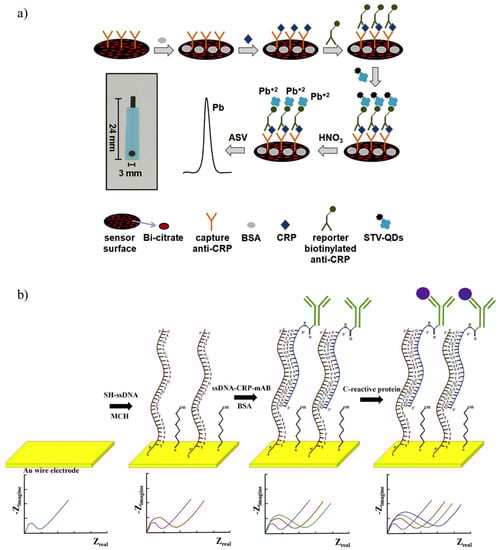 (a) Schematic process of the fabrication and working principle of the bismuth citrate-modified sandwich-type immunosensor proposed in (Reprinted with permission from [93]). The detection was performed by anodic scan voltammetry to detect the release of Pb(II) from the QDs in HNO3; (b) top: DNA-direct immobilization of anti-CRP onto a gold nanowire; bottom: changes in the electrochemical impedance after each step ([97], licensed under CC BY-NC-ND 4.0).