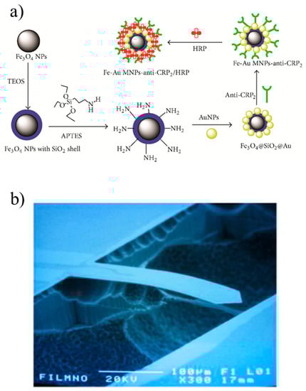(a) Preparation of the Fe3O4-Au magnetic nanoparticles coated with anti-CRP and HRP ([104], licensed under CC BY 3.0); (b) SEM image of the microcantilever fabricated in [111] (licensed under CC BY 3.0).