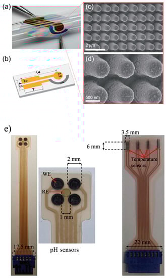 A potential pH sensor that could integrated into a dressing was described by Yoon et al. [128]. A matrix of nanopillars (mixture of polyurethane acrylate and NOA63, diameter about 400 nm) was fabricated on a PET substrate. The WE and RE were fabricated starting with Au/Ti and Ag/Ti depositions, respectively. An Ag/AgCl RE was obtained by electroplating chloride on silver and the coated with the dielectric ink ESL 242-SB mixed with KCl (30 wt %). The WE was obtained by the electrochemical deposition of polyaniline (PANI, about 50 nm thick) on a gold surface (Figure 5a–d). This pH sensor was tested in buffer solution from pH 2 to 12. The response was linear all over the tested range (R2 = 0.99) and the sensitivity was 60.3 mV/pH, even if bent for 1000 cycles. The response time was less than 1 s. Authors verified that the response time increased to about 9 s without the nanopillars structure. The repeatability tests showed a negligible hysteresis, whereas the drift evaluated from 5 to 12 h upon immersion in a buffer solution was 0.64 mV/h at pH 5 and 0.49 mV/h at pH 7. In presence of interfering ions such as Na+, K+, NH4+, Ca2+, and Mg2+, the pH sensor showed an excellent selectivity. This pH sensor obtained comparable results to those of a commercial pH meter when tested with real samples such as coke, coffee, water, and orange juice.
