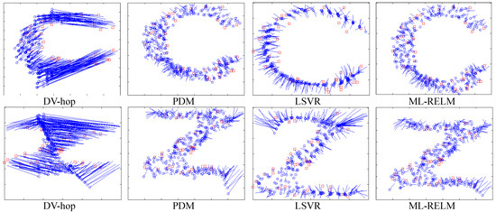It is obvious to observe from Figure 6 that the DV-hop method uses fixed hop-counts vs distances coefficients, and when there is an obstacle, the hop-count and the distance may deviate on converting. Although the PDM method can solve hop-distance deviation to a certain extent, it cannot deal with significantly different scales. For LSVR, the optimization of multiple parameters easily results in over-fitting (unknown nodes estimate an unknown trend to a curve). Nevertheless, estimation accuracy from the proposed ML-RELM is higher than from other localization methods.