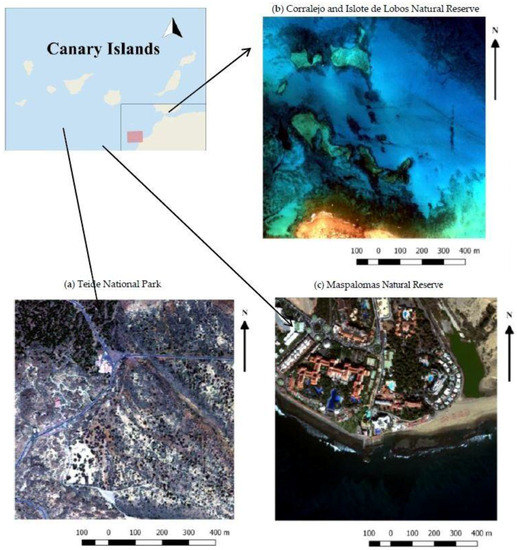 This study focuses on three types of vulnerable ecosystems found in different islands of the Macaronesia region. Macaronesia is considered a geological and a biodiversity hotspot due to the volcanic origin and due to the high degree of vulnerability that insular ecosystems are subjected to, mainly as a consequence of climate change and anthropogenic pressure. The ecosystems selected from the Canary Islands were: the shrubland ecosystem, the coastal ecosystem and, finally, a mixed ecosystem surrounded by a touristic area and a lagoon, as a transitional system within the coastal and land ecosystems. The Canary Islands are one of the most remarkable biodiversity areas on the planet [39], and they are chosen as a representative sample of these ecosystems because of the availability of VHR remote sensing imagery and simultaneous field data. Figure 1 displays the 3 protected areas considered in the analysis.