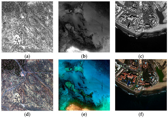 PAN and MS scenes of WorldView-2 images (512 × 512 pixels for the MS image): (a,d) shrub land ecosystem; (b,e) coastal ecosystem; (c,f) mixed ecosystem with urban area and inner water lagoon.
