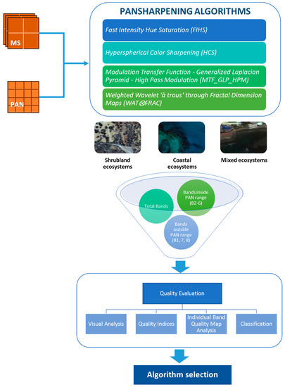 The first four pansharpening techniques were implemented in the three different vulnerable ecosystems; afterwards, a visual and quantitative assessment was undertaken in order to evaluate the pansharpening results in the different fused images. The quality assessment was carried out for the whole set of MS bands, as well as for those MS bands covering the range of the PAN channel (Bands 2–6) and those outside this range (Bands 1, 7 and 8). Furthermore, an individual band quality map analysis was carried out in the best fused images according to each ecosystem type. Finally, a classification map is obtained in the different fused images, to analyze the influence of the pansharpening in the classification result.