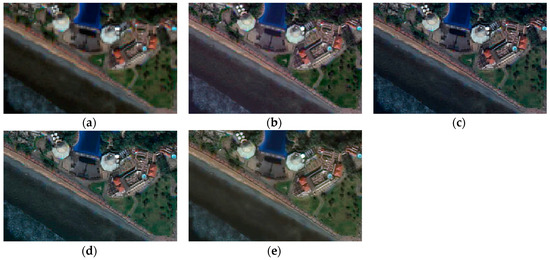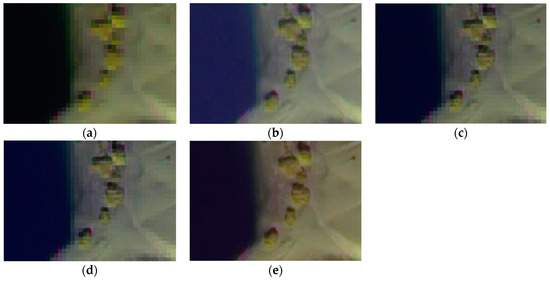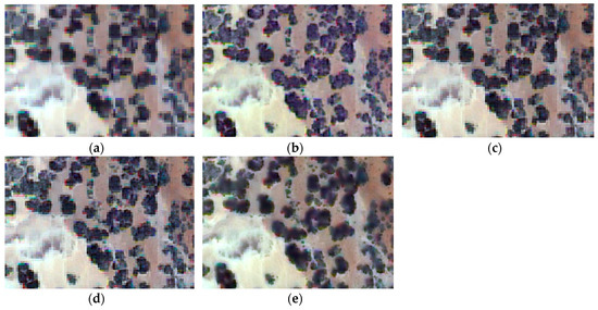 True color fused images of the mixed ecosystem with an urban region: (a) original MS; (b) FIHS; (c) HCS; (d) MTF_GLP_HPM; (e) WAT⊗FRAC with a window size of 15.