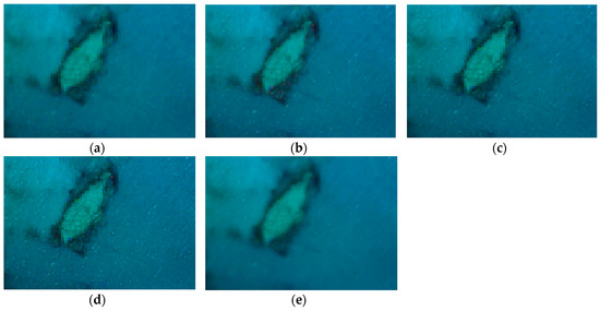 True color fused images of the coastal region: (a) original MS; (b) FIHS; (c) HCS; (d) MTF_GLP_HPM; (e) WAT⊗FRAC with a window size of 27.