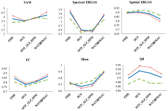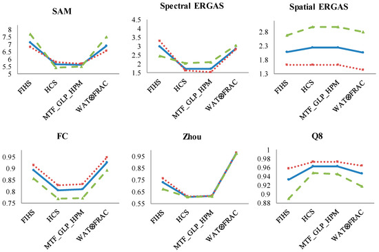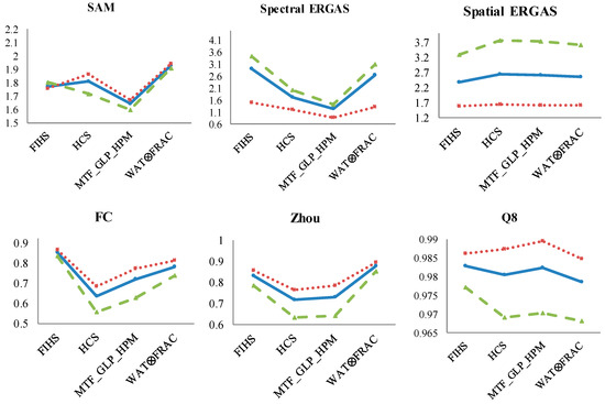 With respect to the band analysis based on the PAN range (Figure 9), from the spectral point of view, SAM provides similar values between the fusion algorithms, and the spectral ERGAS shows better quality images for the MS bands covered by the PAN range, as expected, except in FIHS. Concerning the spatial indices, the Spatial ERGAS and FC metrics achieve a superior spatial quality for Bands 2–6, while Zhou shows very similar results. The Q8 index also gives higher values to the bands covered by the PAN.