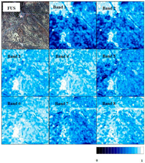 As indicated, the WAT⊗FRAC algorithm was selected as the best compromise to fuse images in a shrubland ecosystem scenario. Quality maps of WAT⊗FRAC (window size of seven) are presented in Figure 11. Better results can be appreciated for Bands 3–8, with Band 4 achieving the best fusion. On the other hand, Bands 1 and 2 (coastal blue and blue) do not show good quality in some areas, with a greater concentration of dark blue pixels, in accordance with the lowest quality results of Table 7.