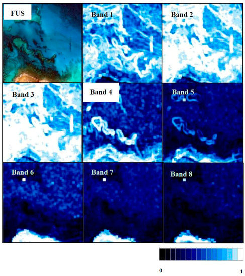 Additionally, a local study was carried out to identify the distortion introduced in each single band by the best fused algorithms chosen for each scenario. In general, Bands 3–8 attained higher quality for land areas, while in water areas, red and near-infrared bands (5, 7 and 8) experience high spectral distortion. However, these bands are not usually used in seabed mapping applications due to their low penetration capability in water.