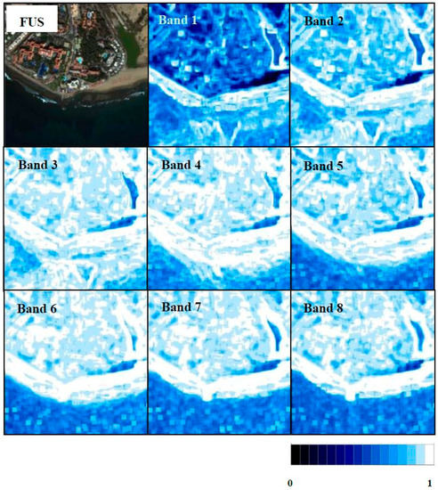 As regards the coastal ecosystem, in the individual band quality maps of FIHS (Table 7 and Figure 12), the higher quality is achieved in Bands 2 and 3, with values over 0.88. For Band 1 (0.764), a light blue aspect (medium quality) in the sea area is clear, whereas, in the land area, both bands get dark blue pixels in the quality maps with this algorithm. From Bands 4–8, the quality increases in land areas, showing mostly dark blue pixels; however, the quality in sea areas decreases considerably. Band 8 gets a quality value of 0.239, while Bands 5–7 show values around 0.3–0.4. Regardless of the fact that the FIHS algorithm gets the best fusion for this scenario, the quality maps are not very satisfactory for longer wavelengths, but this portion of the spectrum is of minimum interest in seafloor mapping applications due to the low capability of light to penetrate the water.