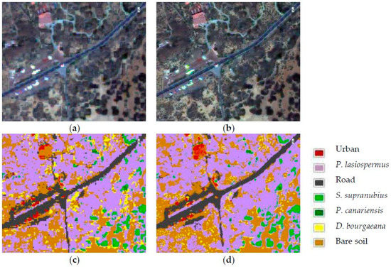 Zoom of the original MS (a) and WAT⊗FRAC fused image (b) of the thematic maps obtained by the OBIA-SVM classifier applied to the multispectral image (c) and WAT⊗FRAC fused image (d) in the shrubland ecosystem.