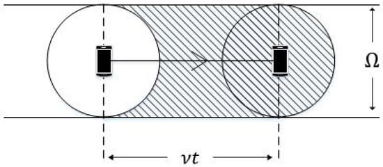 Let us first consider . As shown in Figure 4, we assume that each user has a coverage sensing area represented by a circle, the diameter of which is given by Ω. When a user moves with speed v for a short period of time t, the movement trace can be regarded as a straight line. The sensing area covered by the mobile user during t is , and new BSs may appear within this area. We assume that the user will attempt to handover to a newly appearing BS in the coverage sensing area, and an outage event occurs during a handover. Therefore, the rate of outage arrival is the same as the rate of BS arrival in the coverage sensing area. Because BSs follow a PPP distribution on the plane, it follows that:
