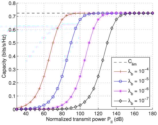 It can be shown that is a convex function of x. Numerical evaluation can be performed to give bits/s/Hz, which shows a constant scaling with . We note that our conclusion conforms with the conclusions obtained via scaling law analysis [28], which predicts that the capacity can grow linearly with . Our model refines the result by obtaining the exact scaling constant as 0.7239. In Figure 5, the optimal capacity is illustrated as a function of with varying based on Equation (22). It is observed that increases initially with increasing or , but eventually reaches the upper bound .