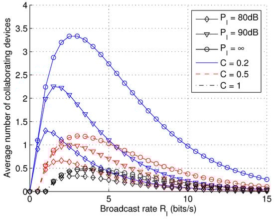 The average number of collaborating devices as a function of broadcast rate with varying transmit power and capacity demand C ( = ).