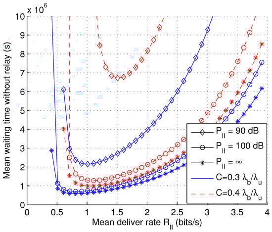In Figure 9, the mean waiting time is shown as a function of average delivery rate with varying transmit power and capacity demand C. The objective function appears to be convex, and the optimal value can be easily obtained via numerical methods.