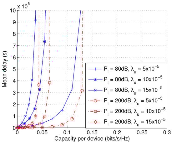 The procedure of our numerical evaluation is as follows: (1) given system parameters (C, L, , , and v) and power parameters ( and ), calculate the optimal rate parameter and according to Equations (44) and (46), respectively; (2) given all of the above parameters, calculate the PDFs of and based on Section 4; (3) calculate the PDF of the accumulated delay D and evaluate its mean value . Without loss of generality, we set and in all cases.