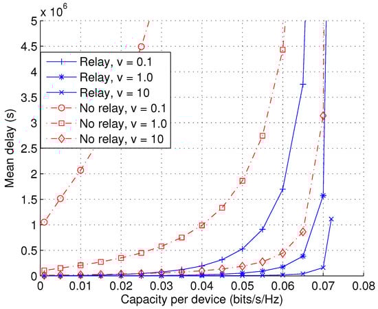 Figure 11 shows the impact of user speed v on the capacity-delay trade-off, for cases with and without user collaboration. We set and to very large values to shed light on to the fundamental performance limits. The trade-off is shown to be sensitive to the speed. For a ten-fold increase of the speed, the delay is shown to reduce by about 90%. In other words, an inversely proportional relationship is observed between speed and mean delay. The benefit of user collaboration (i.e., relay) is shown to be significant, especially when the movement speed is low. This suggests that in practice, allowing D2D communications between low speed and high speed users will effectively reduce the delays of low speed users.