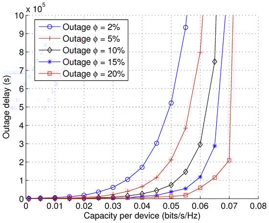 While all of the above numerical results are based on the mean delay, it is also important to investigate the trade-off performance in terms of the outage delay. In practice, a small fraction of packets with large delays is allowed to be dropped by the queue; hence, the outage delay is particularly useful when the delay has long-tail distributions. Given a random delay D and its CDF , the outage delay is defined as the delay value that gives , where is the outage threshold. In Figure 13, we show the capacity-delay trade-off based on outage delay. As expected, we see that the outage delay increases in an exponential fashion when the capacity per user approaches the limit. Moreover, it is observed that the delay reduces with increasing outage probability . Finally, we note that being able to pinpoint the delay distribution and study the outage delay performance is a key merit of the analytical framework proposed in this paper. Our analytical framework can potentially be extended beyond the scenario of cellular communications and applied to other networking paradigms, such as multi-hop sensor networks [53,54,55].
