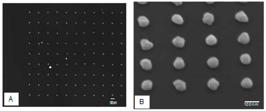 SEM images of nanoparticles obtained with (A) electron beam lithography (EBL) method. The nanoparticles are perfectly aligned within a well-defined array (B) and are not perfectly spherical or ellipsoidal.