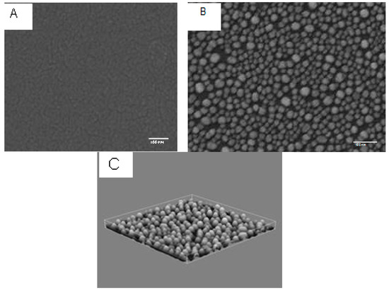 SEM: The morphology of glasses unmodified and modified with different gold films before and after thermal annealing process was systematically analyzed by scanning electron beam microscopy (SEM 6500, Jeol Ltd., Tokyo, Japan). Figure 2A,B shows the morphology of evaporated and annealed gold films, respectively.