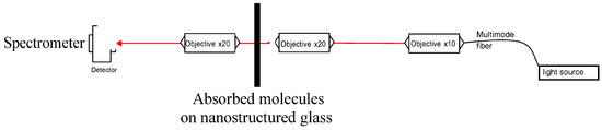 LSPR homemade set-up: The optical analyses of the samples were performed by a home-built confocal transmission UV-Vis-NIR optical setup which allows acquiring the extinction spectra at different positions on the sample. The extinction spectrum is given by the absorbance formula—log (I//I0) where I0 is the intensity of the reference beam. The optical set-up is shown in Figure 3. Thus, optical fibers and lens were aligned; while the incident beam with spatial diameter of 30 µm was focused perpendicularly to the (bio)chemical modified nanostructured glass samples.