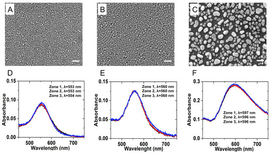 Scanning electron microscope (SEM) images of different gold nanoparticle substrates. The initial gold film thickness was (A) 3 nm for sample 1; (B) 5 nm for sample 2 and (C) 12 nm for sample 3. Scale bar is 100 nm. Extinction spectra of (D) sample 1; (E) sample 2 and (F) sample 3 are presented below corresponding SEM images. Red, blue and black lines present spectra collected from three different zones on each sample. The morphological and optical properties of each sample are listed in Table 1.