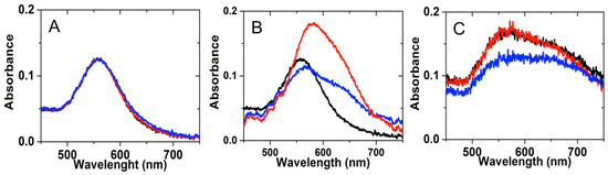 The extinction spectra of (A) Au nanoparticle substrate (sample 2); (B) dried BPE molecules and (C) dried Cyt-b5 molecules onto annealed Au nanostructures using 2 µL drop solution. Red, blue and black lines present spectra collected from three different zones on each sample.