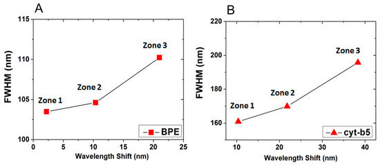 Relation between FWHM and wavelength shift for (A) BPE and (B) Cyt-b5 molecules using the recorded spectra from three independent zones exposed to drops of specific biomolecules solution namely BPE and Cyt-b5, respectively.