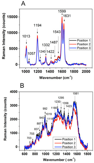In the case of reduced Cyt-b5 biomolecule in aqueous solution, its SERS spectrum shows the presence of two specific bands at 1338 cm−1 and 1303 cm−1 (Figure 7B). These SERS results are in excellent agreement with the published Raman [33] spectrum proving the high efficiency of authors proposed metallic substrates. Further, the comparison of Raman spectra for Cys-b5 is given in Table 4.