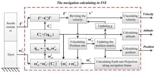 Gyros and accelerometers are the main Inertial Measurement Units (IMUs) of INS, and the vehicle’s navigation information is obtained by the calculation process based on the IMU measurement. The principle of INS is shown in Figure 1 [46,47,48].