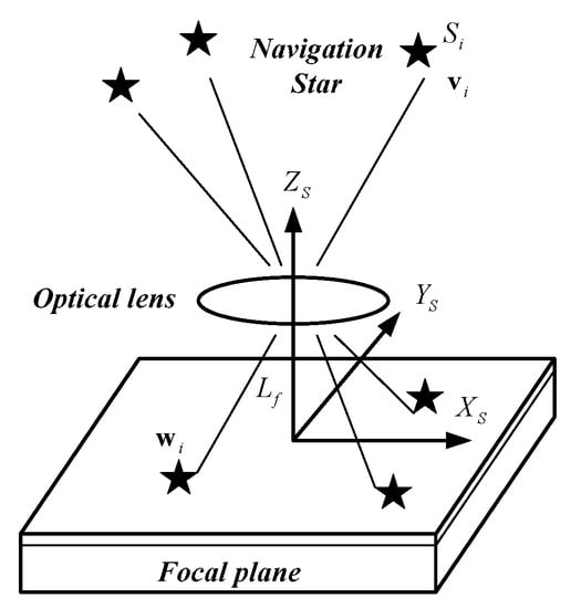 A star sensor is an electronic camera connected to a microcomputer. Stars can be located and identified by using a sensed image of the sky. The orientation of the vehicle can be determined by the observation [49]. As shown in Figure 2, navigation star Si with direction vector vi in the celestial coordinate system can be detected by the star sensor, whereas the vector of its image can be expressed as wi in the star sensor coordinate system.