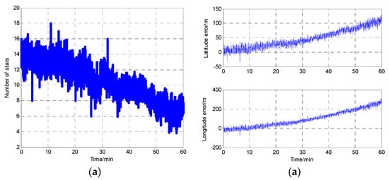 In order to prove the viewpoint that the star sensor accuracy can be influenced by the number of stars in the FOV, an experiment is performed. In the experiment, the star sensor is installed on the ground outside. The number of stars in FOV is collected by computer. During the experiment process, sometimes there are clouds in the sky. Hence, the number of stars in the FOV is changed. In addition, the position (latitude and longitude) of the experiment location are known before the experiment, so the difference between the known position information and the star sensor position information can be used as the judging standard of star sensor accuracy. Figure 3 shows the experiment result within 60 min under the bad weather. Figure 3a is the number of available stars during this time period, and the positioning error provided by the star sensor during this process is shown in Figure 3b. Both figures take time as the abscissa, and the results in these two figures are in the same time. Therefore, Figure 3 shows the star sensor position accuracy is changed with the number of available stars.