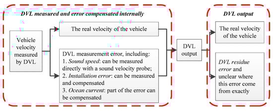 Sound speed, installation error and ocean currents are the main DVL error factors, and most of the DVL errors caused by these factors can be calculated and compensated before DVL velocity output. However, not all DVL velocity errors can be compensated, which means that there is a residual error as the component of DVL velocity output and influence the DVL accuracy [36,37,50,51,52]. It means that the components of DVL output includes the vehicle’s real velocity and the DVL residue error, and the DVL residue error is unclear where it comes from. Therefore, the DVL residue error is main error, which is the most concern in this paper. The relationship described above is shown in Figure 5.