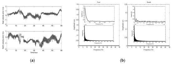 The DVL velocity residue error, which is the difference between the DVL velocity and the reference velocity, is shown in Figure 6a. From the curves, it can be seen that the residual velocity error is full of noise and continuous variation, and the form of the DVL velocity error cannot be obtained. In this paper, the form of the DVL velocity error is more of concern than the error source of the DVL velocity residue error. Therefore, the analyzed method by frequency is carried out to confirm. Figure 6b is the amplitude-frequency curves of the DVL velocity error along east and north during 60 h, and these frequency curves are obtained by Fourier transformation (the fft function in Matlab) with the DVL velocity error in Figure 6a. The meaning of the amplitude-frequency curve is the velocity component with different frequency, and the two small curves in figures are the enlarged drawing.