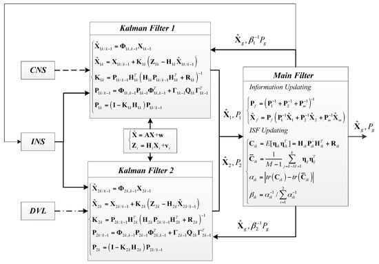 The federated filter, proposed by Carlson [40], is a two-stage data processing technique. Sensor-related filters are subsequently processed and combined by a larger master filter. The advantage of this filter is that a subsystem which works at a fault state can be detected, and then it can make other subsystems operate normally [41,42,43]. Hence, the Federated Filter can be used as the data fusion method for an INS/CNS/DVL integrated navigation system. When the CNS cannot work in bad weather or the accuracy of the DVL is not good enough for the integration navigation system, the faults of the navigation subsystem (CNS or DVL) of the integration navigation system can be detected and separated by the Federated Filter, and the influence of the reference information accuracy obtained from CNS or DVL in the integration system can be avoided. In addition, an important parameter of the Federated Filter is the Information Sharing Factor (ISF), which can judge the “contribution” of each sub filters, and the performance of the Federated Filter is determined by ISF. Hence, it is of importance to set the value of ISF. In Carlson’s original Federated Filter the information is shared equally between filters, so the ISF for each filter is the same (e.g., for three filters, ISF = 1/3). More recent works adaptively change the ISF based on the eigenvalues of the covariance matrix [44] or the trace of the covariance matrix [45]. In this paper, we adjust the ISF based on the difference between the expected covariance (which can be calculated directly) and the observed covariance over a window of M samples. This allows our federated filter to identify unexpected degradation in measurement quality. Therefore, an approach of setting ISF adaptively based on the innovation covariance is proposed, which is purposely designed for the INS/CNS/DVL integrated system in this paper.