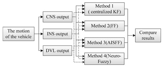 Compared with taking the position error or velocity error as the only observable, the advantage of using the centralized Kalman Filter is that the observability of the state variables is improved. The limitations of centralized Kalman Filter methods are that the navigation systems can be illustrated when the system is applied. For example, when the CNS is out of order under bad weather conditions, the position accuracy of CNS is decreased, and the difference between the INS position and CNS position is not the INS position error. Similarly, when the DVL velocity accuracy is influenced by other factors, the difference between the INS velocity and DVL velocity is not the INS error. Based on the principle of the centralized Kalman Filter, once the accuracy of one of the observations decreased, the INS error cannot be estimated exactly. Hence, the stability of the navigation information based on the centralized Kalman Filter is decreased when the observed variables fail due to the DVL error or the CNS is out of order.
