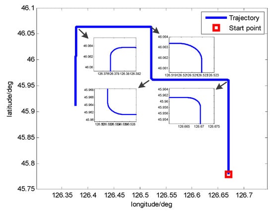 The inertial position of the vehicle is 45.7796° N, 126.6705° E and the initial attitude is 0°, 0°, 30°. The vehicle’s trajectory of the simulation is shown in Table 1 and Figure 10.
