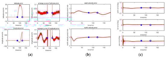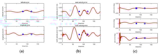 Based on the principle of INS, the position, velocity, and attitude equations for INS are expressed in (1). Compared with the plane and spaceflight system, the ship’s altitude is changed less than 100 m. Therefore, in order to simplify the problem, the navigation information related with the altitude in the INS error equation is ignored because the research topic of this paper is USVs. The current position, velocity, and attitude can be obtained by integrating these equations with the angular rate and the acceleration data from IMU in real time: