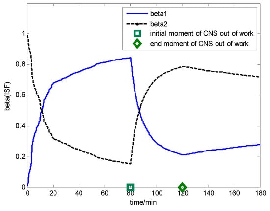 According to the ISF, it is obtained that the accuracy of the position information from CNS is better than that of DVL in the initial state (0~80 min). Hence, the contribution of subfilter 1 should be more than that of subfilter 2, which is the reason of beta1 increasing and beta2 decreasing in Figure 15. When the CNS is out of order during the time period of 80~120 min, the accuracy of the position information from CNS is worse than that of DVL, hence, the contribution of subfilter 1 should be less than that of subfilter 2, which is shown in the time period of 80~120 min (beta1 decreasing and beta2 increasing). When CNS is recovered and working normally, it is seen that the contribution of subfilter 1 is more than that of subfilter 2, which is shown in the time period of 120~180 min (beta1 increasing and beta2 decreasing).