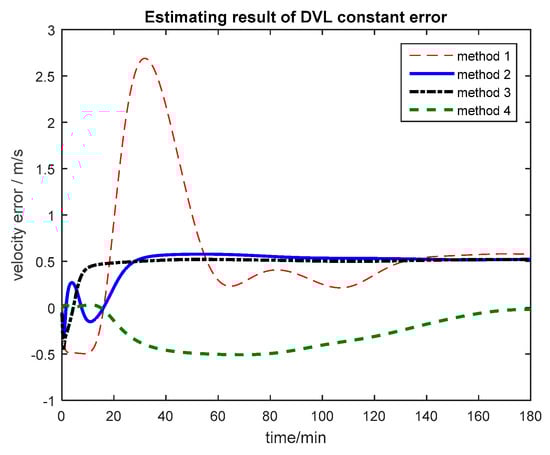 Based on the curves in Figure 16, the DVL constant error can be estimated by introducing this item as the state vector by the first three methods, but the time to converge of the algorithm based on the Federated Filter is less than that of Kalman Filter and Neuro-Fuzzy method. The influence of DVL constant error on the integrated navigation system can be avoided.