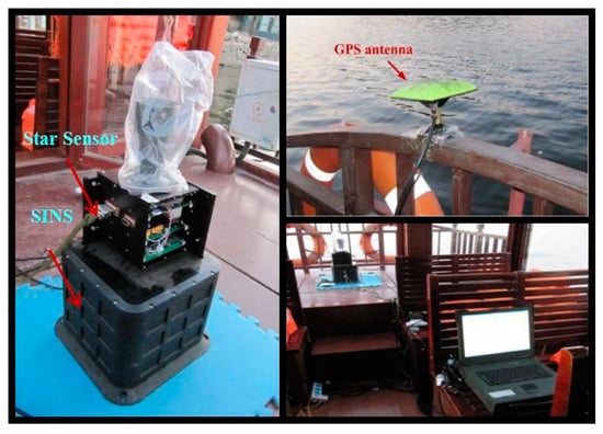 In this section, experiments are carried on the lake to further verify the superiority of the integrated navigation method for INS/CNS/DVL using AISFF. The INS, CNS and DVL are installed on the ship. The INS is developed by our lab. The main sensors of INS are gyros and accelerometers, and measurement constant error of theses sensors (including gyro constant drift, gyro scale factor and installation error, accelerometer bias, accelerometer scale factor and installation error) are estimated and compensated by the equipment test in the laboratory. For the testing methods readers can refer to [54]. In addition, the gyro drift and the accelerometer bias in Equation (2) are the estimation error, which is the difference between the IMU real output error and the estimation result in the laboratory. The performance of the gyros and accelerometers are shown in Table 2.