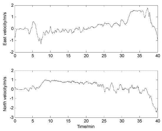 The experimental devices are shown in Figure 17. The speed of the ship along east and north of the navigation frame during the experiment is shown in Figure 18. And based on the speed of the ship, it can be concluded that the total path length for the experiment is about 1945 m.
