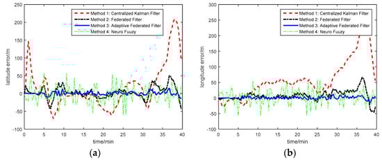 Experiment result with three integrated navigation methods: (a) Latitude error; (b) Longitude error.