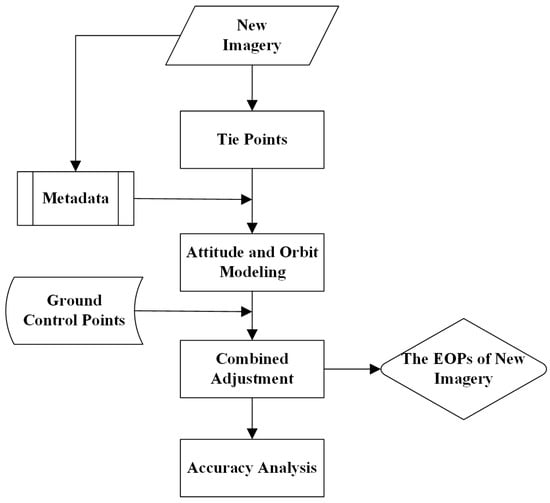 In this paper, the proposed orientation method for the new imagery using the oriented imagery comprises four parts. First, tie points are acquired by matching new imagery with the oriented imagery. Second, attitude and orbit are modelled based on metadata, and they can be refined with the EOPs of oriented imagery. Third, The EOPs of new imagery and 3D coordinates of the tie points are calculated by combined adjustment. Finally, accuracy is assessed. A flow chart is shown in Figure 2.